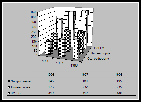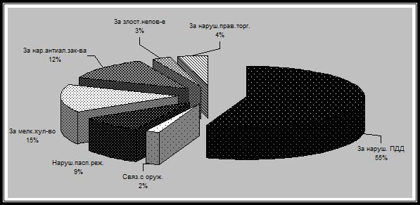 За 1998 г. в Охе и Охинском районе были выявлены 6748 административных правонарушения, что на 3,6% больше, чем в 1997 г. (6282), в том числе: за нарушение правил дорожного движения – 3740 (3550), за нарушения, связанные с приобретением, хранением и продажей оружия – 137 (139), за нарушение паспортного режима – 597 (358), за мелкое хулиганство – 984 (1505), за нарушение антиалкогольного законодательства – 822 (938), за злостное неповиновение сотруднику милиции – 174 (34), за нарушение правил торговли – 282 (215).(Рис.1).