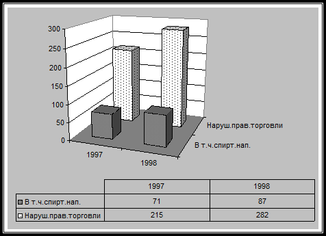 УИМ. Как уже было сказано выше, Сахалинская область является "лакомым куском" для предпринимателей, завозящих на остров товары народного потребления, при этом, часто пытаются реализовывать некачественный, купленный по сниженным ценам и поддельными сертификатами, товар. Особенно большой урон местному бюджету наносят правонарушения связанные с нарушениями в сфере торговли спиртными напитками. Некачественная, но дешёвая водка, конкурирует с вино-водочной продукцией, выпускаемой местным пищекомбинатом, доходы от продажи которой, составляют большую долю от получаемых в местный бюджет средств. За нарушение правил торговли было составлено протоколов об административном правонарушении: в 1998 г – 282, а 1997 г. 215, в том числе за нарушения правил торговли спиртными напитками соответственно 87 и 71.