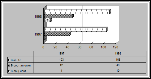Количество правонарушений, предусмотренных ст. 158, 162 КоАП РФ, соответственно - «мелкое хулиганство» и «распитие спиртных напитков в общественных местах или появление в общественных местах в пьяном виде», не отражают реальное положение вещей. Львиная доля вышеупомянутых правонарушений выявляется милиционерами патрульно-постовой службы милиции, которая в количественном отношении составила: в 1997 г. ст. 158 КоАП РФ – 583, ст. 162 КоАП РФ – 738, соответственно в 1998 г. 452 и 516, что явилось