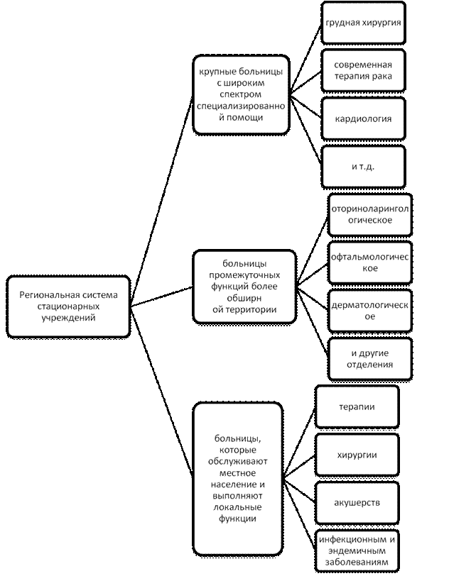 Современная региональная система состоит из трех групп больниц, различных по объему и функциям (ПРИЛОЖЕНИЕ Б). В первую группу входят больницы, которые обслуживают только местное население и выполняют локальные функции. Обычно они имеют отделения по терапии, хирургии, акушерству, инфекционным и эндемичным для района заболеваниям.