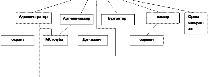 Во главе данной организации будет находиться генеральный директор. В его непосредственном подчинении будут находиться: администратор, арт-менеджер, бухгалтер, кассир, юрист-консультант.Для начала все выше перечисленные будут приносить ему каждый месяц отчет о функционировании порученной им отрасли, а в последующем каждые полгода полный отчет о их деятельности. Так как предприятие новое и только планируется, то генеральный директор будет совмещать всю эту работу, всё контролировать, во всем принимать участие, чтобы не упустить ни одной детали. Тщательно подбирать персонал, т.к. персонал клуба – лицо клуба. Люди, которые работают в клубе, формируют отношение к ней у клиента не меньше, чем интерьер или меню. В число должностей, представленных в организации входят: бармены, официанты, повар, ди джеи, световеки, танцоры, уборщицы, гардеробщицы, служба контроля.