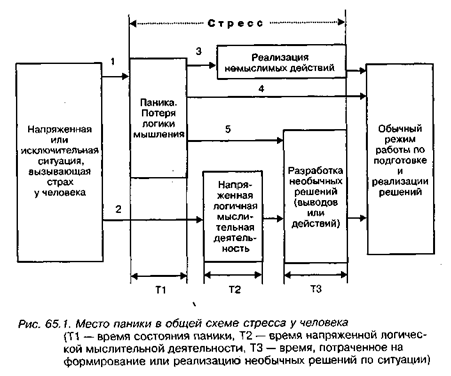 Стресс включает три основные части: собственно панику, осмысленную деятельность и разработку выводов или действий. Общая схема стресса показана на рис. 65.1.