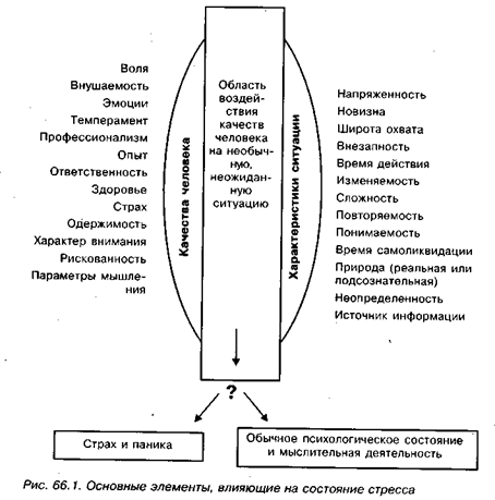 Совокупность набора качеств человека и имеющейся конкретной напряженной или неожиданной ситуации определяет уровень страха, возникающего у человека. При этом ситуация может быть скоропреходящей или длительной, детерминированной или с элементами неопределенностей (рис. 66.1).