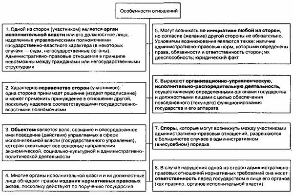 В административно-правовых отношениях могут участвовать различные стороны, в них всегда имеется обязательная сторона, без которой такого рода отношения не возникают. Такой признак наблюдается в административных отношениях как прямое действие властной природы государственно-управленческой деятельности. Например, гражданин не может выступать в подобной роли, хотя и является потенциальным участником самых разнообразных административно-правовых отношений. Как указывалось выше, административно-правовые отношения возникают в сфере государственного управления. Однако не всякое общественное отношение в сфере государственного управления включается в круг отношений, составляющих предмет административного права.