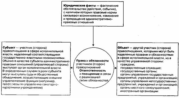 Административно-правовое отношение, как и все другие правоотношения, имеет структуру (см. Приложение №2), а именно системную совокупность взаимосвязанных обязательных элементов: участники (стороны) правоотношения – субъект и объект управления; их субъективные права и юридические обязанности; поощрения и ответственность участников: юридический факт (факты).