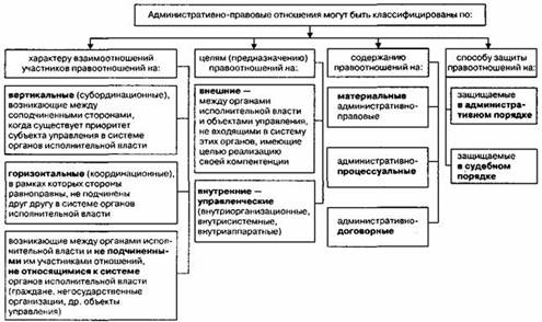 Учитывая многообразие сферы государственного управления, можно сделать бесспорный вывод о том, что и административно-правовые отношения, складывающиеся в ее пределах, различны по своему характеру, содержанию и направленности. Отсюда — возможность их видовой классификации по определенным критериям, выработанным наукой административного права [9] .