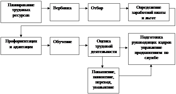 управление персоналом: решение вопроса об определении стандарта для подходящих кандидатов, подбор подходящих работников, отбор работников, установка стандартов работы, компенсации работникам, оценка выполнения работ, консультирование работников, обучение и развитие работников;