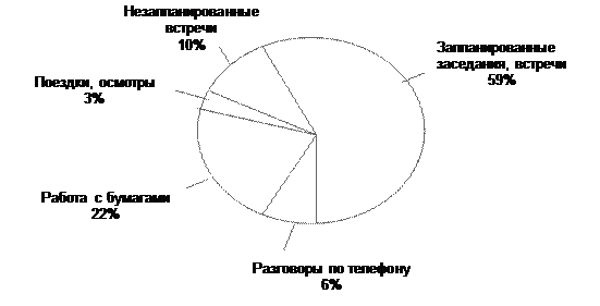 В частности, российские руководители весьма неэффективно распоряжаются своим рабочим временем. Это зависит от типа деятельности, уровня управления, и прочее. В среднем хронометрия рабочего времени представлена на рисунке 1.