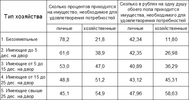 Из таблицы №2 мы видим прямую связь между личными и хозяйственными видами имущества. Если у бедняка мало инвентаря, скота и т.д., а если еще он относится к категории "безземельные", то ценность остального имущества возрастет. Таблица подтверждает мысль о том, личные потребности возрастают от малоземелья к многоземелью, то же можно сказать и о хозяйственных потребностях, рост которых происходит быстрее. Таким образом, мы видим, что личные и хозяйственные потребности составляют одну из категорий бюджета.