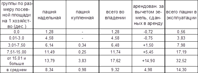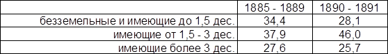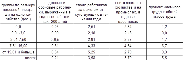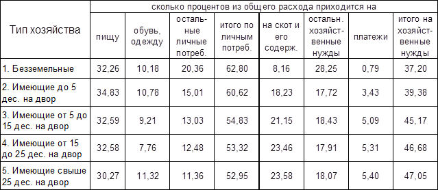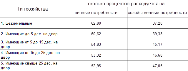 Из таблицы №1 мы видим, что личные потребности уменьшаются от безземелья к многоземелью, а хозяйственные наоборот возрастают, то есть чем беднее хозяйство, тем относительно больше оно тратит на пищу, одежду, и меньше на содержания своего хозяйства. Но как только у крестьянина появлялись материальные средства, он начинал увеличивать свое хозяйство, что сопровождается и увеличением расходов на это хозяйство.