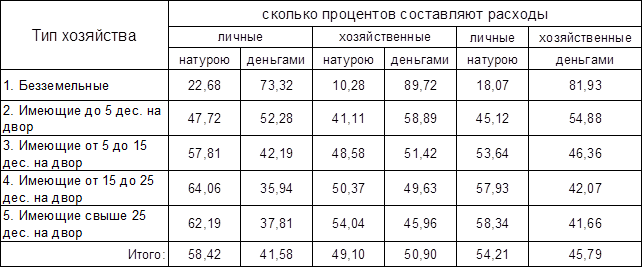 Таблица №5 позволяет сделать вывод о том, что в земледельческих хозяйствах преобладают натуральные расходы над денежными: на 45,79% денежных приходится 54,21% натуральных. Это преобладание еще более выражено в расходах на личные потребности, по которым денежная часть составляет 41,58%, а натуральная - 58,42%. В хозяйственных потребностях натуральная и денежная часть очень близки, но преобладает денежная - 50,9%, натуральная - 49,1%.