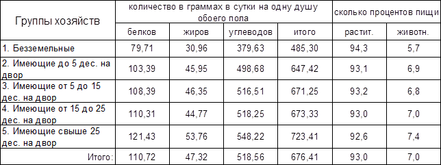 Таким образом, чем больше обеспечена группа землею или чем богаче она, тем в большем количестве входят в пищевую порцию основные элементы питания и больше абсолютное количество потребляемой пищи.