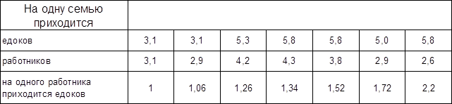 Семья, состоящая из пяти человек: отец, его жена, сын 18 лет, две дочери-подростки. Кроме них в доме живут две постоянные работницы и четыре сезонных работника, то есть всего 11 человек, из которых 9 взрослых. Данное хозяйство являлось хозяйством среднего достатка, которое сверх занятий земледелием держало еще земскую постовую станцию. На питание 11 человек семья тратила 545 рублей, то есть на одного человека 49 руб. 60 коп., из которых на растительную пищу - 21руб. 80 коп., на животную - 27 руб. 80 коп. Причем сюда не вошла стоимость непосчитанной домашней птицы и все покупные продукты, например, сахар.[32]