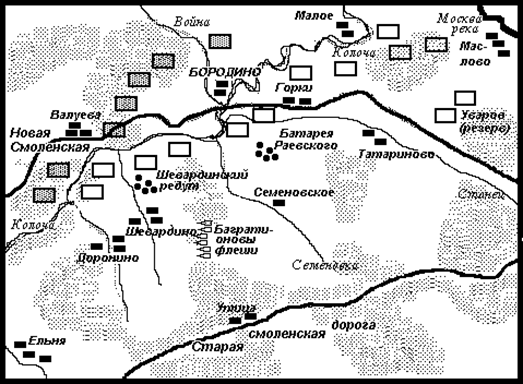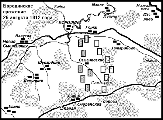 Армия Наполеона подходила к Бородину тремя колоннами. Основные силы - пехотные корпуса Даву, Нея, Жюно, гвардия и два кавалерийских корпуса Мюрата, находившихся в авангарде - продвигались по Новой Смоленской дороге. Справа следовал по Старой Смоленской дороге корпус князя Понятовского, а слева, по проселочным дорогам, - корпус Богарне, впереди него наступал кавалерийский корпус Груши. Около полудня французские войска стали подходить к позиции русской армии.