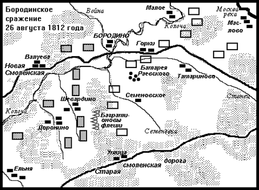 Бородинское сражение продолжалось от 5 часов 30 минут до 18 часов 7 сентября 1812 года. В течение дня бои происходили на разных участках Бородинской позиции русских, на фронте от деревни Малое на севере до деревни Утицы на юге. Самые длительные и напряженные бои происходили за Багратионовы флеши и за батарею Раевского.
