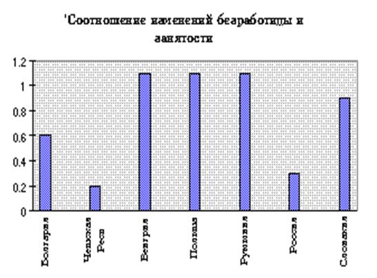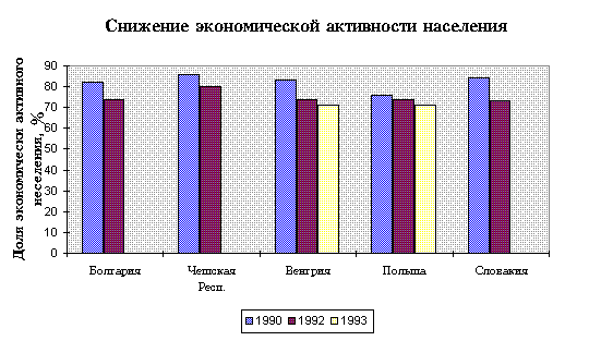 Безработица, которая ранее каралась по закону как тунеядство повсюду в Восточной Европе, где у власти находились коммунистические режимы, не только получила права гражданства, но и стала важнейшей политической и экономической проблемой этих стран. За короткий срок уровень безработицы в некоторых странах вырос с практически нулевой базы до критической отметки, в других же странах события на рынке труда были куда менее драматичными. Главным фактором роста безработицы было существенное снижение занятости в государственном секторе , следствие "поворота" производства лицом к потребителю. Частично это снижение компенсировалось сокращением экономической активности населения . Но степень изменения экономической активности сильно различалась по странам, в результате чего обнаружились глубокие отличия в соотношении прирост численности безработных/уменьшение занятых. Теперь стало очевидным, что лишь на первом этапе перехода к рыночной экономике снижение экономической активности "срабатывало"