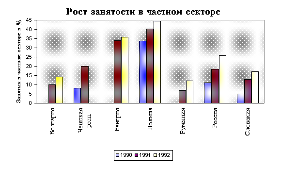как фактор, замедляющий рост безработицы. Достаточно скоро эта возможность поглощения потенциально безработных оказывается исчерпанной. Ясно обозначились три пути эволюции безработицы в странах Восточной и Центральной Европы. В Польше, Венгрии и Чешской Республике спад, затронувший государственные предприятия, сопровождался мощным ростом частного сектора. В этих странах ключевой вопрос заключается в том, как далеко должно зайти сокращение занятости в государственном секторе и насколько устойчивым окажется рост частного сектора по завершении в экономике процесса перераспределения трудовых ресурсов. В Болгарии, и в меньшей степени в Словакии, сильное сокращение занятости в государственном секторе не сопровождалось равным по силе ростом частных предприятий. Поэтому ключевой вопрос здесь - не окажется ли та цена, которую общество платит за реформы в виде безработицы и экономического спада, слишком высокой в политическом плане, и не приведет ли это к их замедлению. В России, и отчасти в Румынии, отсутствие жестких финансовых ограничений для государственных и полугосударственных предприятий позволяет им