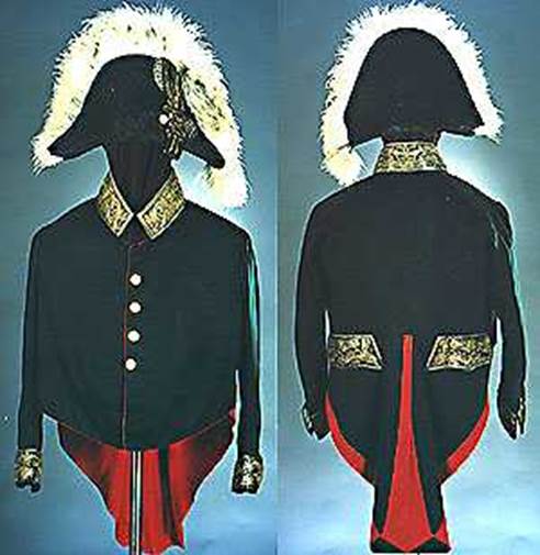 Вообще мундир – официальная форма одежды, соответствующая титулам служебного и сословно-родового положения их обладателей и визуально их выражавшая. По мундиру можно было определить род службы, ведомство и класс чина. Придворные чины носили в основном тёмно-синий, почти чёрный мундир и такую же шляпу с плюмажем (см. приложение 3). На мундирах придворных чинов нередко красовались ордена Андрея Первозванного или Георгия 1 и 2 степени3 . Некоторым чинам, кроме того, давались специальные знаки отличия. Так, обер-камергеры и камергеры в качестве знака их чина получали ключи. Первые из них – золотые, осыпанные бриллиантами, которые носились на боку – «на правой стороне, на шнуре золотом с двумя висящими массивными кистями». Вторые –золотые, которые носили на андреевской «голубой ленте, связанной бантом, на левой стороне подле клапана»4 .