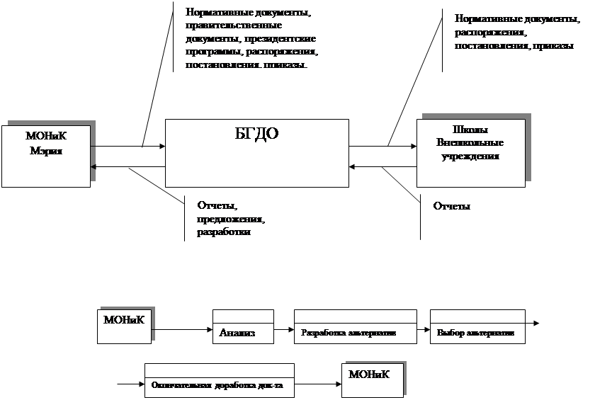 Говоря о задачах информатизации прежде всего нужно рассмотреть, что они собой представляют в анализируемом нами БГДО. Во-первых, БГДО как система имеет свои границы. Помимо этого существует вход-выход для информации от вышестоящих организаций МОНиК и Мэрия такой, как приказы, вновь разработанные положения, регламентирующие работу и вносимые изменения в структуру и функции самого БГДО и ему подчиненных школ и дошкольных учреждений. Еще на входе информация от подчиненных БГДО школ и дошкольных учреждений, включающая в себя отчеты о материальном состоянии школ, о проделанной работе(зачетах, аттестациях, экзаменах, олимпиадах и.т.д). Мы видим, что в потоке информации поступающей в БГДО преобладает информация отчетного свойства. И в связи с наличием разно функциональных отделов это информацию необходимо разбить по определенным критериям(требованиям) каждого отдела и распределить по отделам- это одна из задач. Следующей задачей является анализ поступившей информации. Ну и наконец, последней задачей мы считаем подготовку документов на выход из данной информационной системы БГДО. Мы, производя анализ БГДО, столкнулись с интересным фактом, что в такой ответственной организации нет достаточного количества компьютеров для обработки информации. И мы не только надеемся и предполагаем, но и настоятельно рекомендуем, чтобы в дальнейшем информация БГДО обрабатывалась с использованием современных методов и технологий и соответствовала современным требованиям, то есть быстрой(легко поддающейся обработке и распространению), короткой и достоверной.