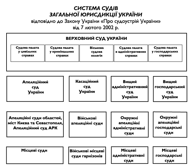 Высочайшим судебным органом в системе судов общей юрисдикции является Верховный Суд Украины. Высшими судебными органами специализированных судов являются соответствующие высшие специализированные суды. Воинские суды приналежат к общим судам и осуществляют правосудие в Вооруженных Силах Украины и других воинских формированиях. Специализированными судами являются хозяйственные, административные и прочие суды, определенные как специализированные суды.