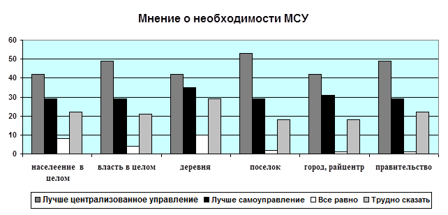 Практика показывает, что внедрение местного самоуправления в решающей степени зависит от отношения к нему со стороны населения и властных структур.