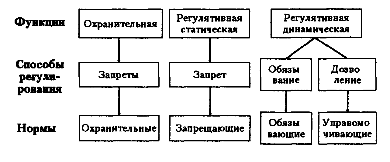 Нормы права подразделяются на виды по самым разным основаниям. И здесь три фактора оказывают наиболее существенное влияние. Это - функции права и индивидуальное регулирование общественных отношений4. Так как социально-юридические функции обуславливают строение права, то главное подразделение функций на регулятивные и охранительные предопределяет и главные виды юридических норм. Но сразу же нужно учитывать и действие такого фактора, как специализация права. И общая классификация дополняется третьим звеном, и таким образом нормы права подразделяются на охранительные, регулятивные и специализированные.