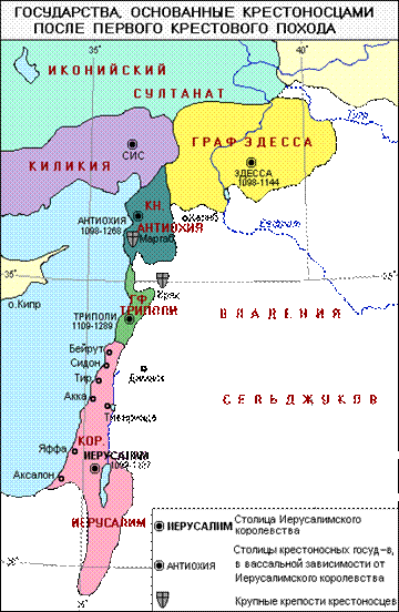 Кроме того, крестоносцы уже с весны 1099 г. вели войну с греками из-за приморских городов. В Малой Азии византийцам удалось возвратить себе значительную территорию: их успехи могли быть здесь еще значительнее, если бы они не тратили своих сил в борьбе с крестоносцами из-за отдаленных сирийских и киликийских областей. Наконец, с самого начала шла борьба и между самими крестоносцами из-за обладания разными городами. Значительную поддержку иерусалимскому королевству оказали образовавшиеся вскоре духовно-рыцарские ордена тамплиеров и госпиталитов (иоаннитов).