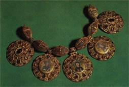 круглых массивных колт, которые прикреплялись к головному убору в качестве подвесок, барм (ожерелий), браслета, перстней и серег. Форма предметов, сочетание техник, цветовая гамма эмалей свидетельствуют о том, что эти украшения сделаны в XII веке мастерами Рязани.