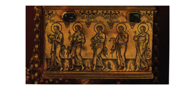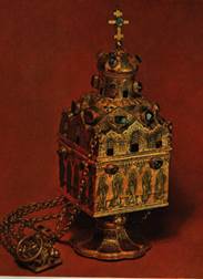 Искусство русских ювелиров этого периода является частью высокой культуры Древней Руси. Один из редчайших экспонатов - серебряная золоченая оправа мощевика из ризницы Благовещенского собора Московского Кремля с чеканным изображением в рост св. Пантелеймона и Стефана, - может быть отнесен к первой половине XIV века - тому сложному периоду русской истории, когда золотоордынские полчища грабили и жгли русскую землю, огнем и мечом уничтожали все на своем пути, когда рекой лилась людская кровь, ибо завоеватели, по словам летописца, «люди секуще аки траву». В памятниках прикладного искусства той поры воплотились патриотические идеи и идеи воинского подвига, являвшиеся отражением вековой борьбы народа за освобождение от иноземного ига.