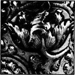 Особой декоративностью отличаются черневые узоры на золоте. Серебряный складень с резными композициями на внутренней стороне створок имеет внутри икону конца XVI века в золотом окладе, с жемчужной обнизью и драгоценными камнями. Черневой орнамент по золотому канфаренному фону служит основным средством художественной выразительности вещи в целом.