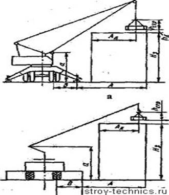 Рис.1. Технологические схемы для определения места установки у здания автомобильного крана с решетчатой (а) и телескопической (б) стрелами.
