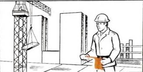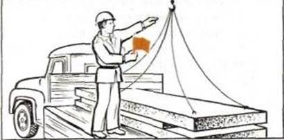 Перед подъемом грузов машинист крана предупреждает работающих монтажников звуковыми сигналами. Сигналы о подъеме и перемещении деталей на складе подает стропальщик, а на монтируемом здании — звеньевой. Если между ними нет прямой зрительной связи, назначается сигнальщик, который должен находиться в зоне видимости стропальщиков и монтажников. Сигналы машинисту крана должен давать только один человек.