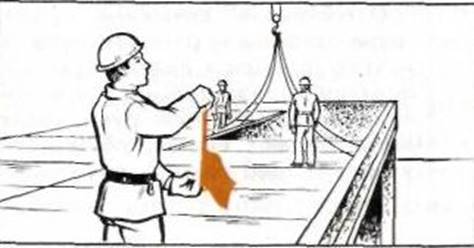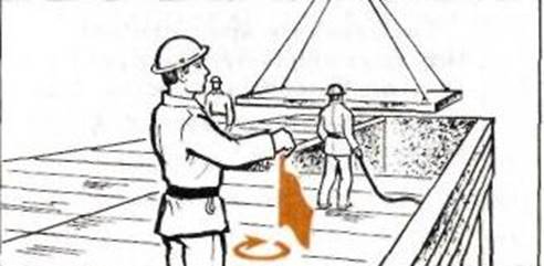 Поднять груз или крюк — правая рука согнута в локте с флажком, направленным вверх; флажком описываются круговые движения