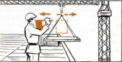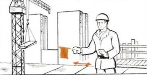 Передвинуть кран или переместить груз вдоль пути — рука согнута в локте с флажком на уровне пояса, движение руки в сторону движения крана