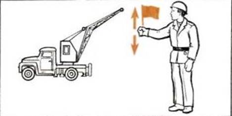 Поднять или опустить стрелу — движение вытянутой правой руки с флажком вниз — вверх; при подъеме стрелы флажок обращен вверх, при опускании — вниз