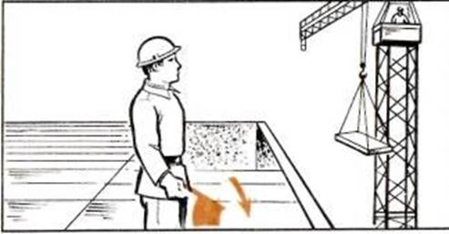 Посадить груз на место или незначительно опустить груз или крюк — правая рука согнута в локте с флажком, направленным вниз; под флажком ладонь левой руки