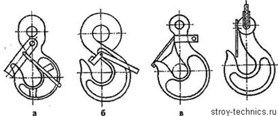 Рис. 2. Грузовые крюки с предохранительной планкой (а), предохранительной скобой (б), поворотным козырьком (в), упругой пластиной (г).