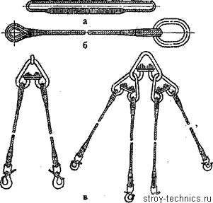 Рис. 3. Стропы для подъема грузов: а — универсальный кольцевой; б — облегченный одноветвевой; в — многоветвевой.