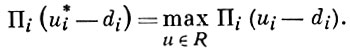 u = {u(u1 , ..., un )} - множество дележей, d = (d1 , ..., dn ) - точка status quo, т. е. точка, соответствующая случаю, когда никакой дележ не осуществляется, [R, d] - игра с дележами, u - ее арбитражное решение. Дележ u* наз. решением Нэша, если