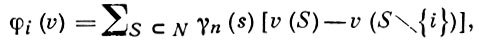 γn (s) = (s - 1)!(n - s)!/n!, s - число элементов множества S, также удовлетворяет аксиоме симметрии, кроме того, ∑i φi (v) = v(N) и для любых двух игр u и v выполняется φ (u + v) = φ (u) + φ (v). Были также рассмотрены А. с. для случая сравнимых индивидуальных выигрышей (см. [3]).