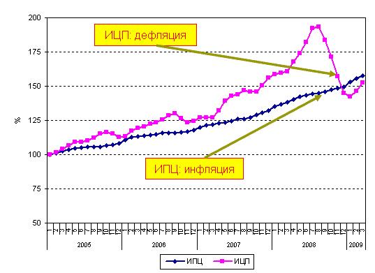 Рисунок 3 Индексы потребительских цен и цен производителей промышленной продукции, 2005-2009 годы, % (январь 2005 года = 100%)
