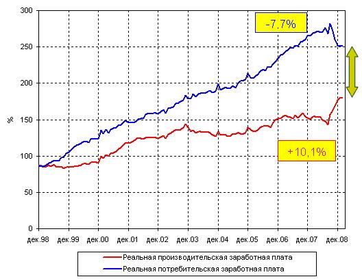 Рисунок 4 Индексы реальной "потребительской" и реальной "производительской" заработной платы, 1998-2009 годы, % (промышленность, декабрь 1998 года = 100%)