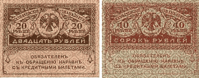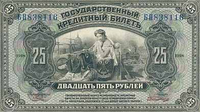 Указом Временного правительства от 23 августа 1917 года началась эмиссия новых денежных знаков достоинством 20 и 40 рублей, получивших в народе название "керенок" (см. рис. 7). Временное правительство планировало провести массовый выпуск новых денег и в 1917 году в США был размещен заказ на изготовление государственных кредитных билетов номиналом в 50 копеек, 25, 50, 100, 250, 500 и 1000 рублей. Однако эти денежные знаки начали поступать в Россию лишь в 1918 году, т.е. после Октябрьской революции. Позднее билеты номиналом 50 копеек, 25 и 100 рублей были использованы правительствами Колчака, Временным правительством Дальнего Востока и Временной властью Забайкалья. Кредитные билеты, изготовленные в США, значительно отличались от денежных знаков, отпечатанных в России. В их разработке участвовали американские специалисты, что привело к появлению на них элементов узоров, характерных для долларовых купюр. Отпечатаны они были на бумаге темно-серого или коричневого цвета.