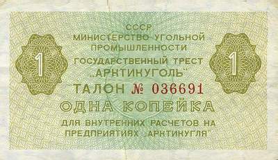 | Внизу - денежный знак, введённый СССР на предприятиях треста "Арктикуголь" в посёлках Пирамида и Баренсбург на Шпицбергене (протекторат Норвегии) для внутреннего товарообмена. |