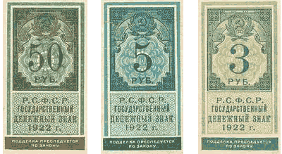 | Купюры 1, 2 и 3 рубля были первыми деньгами, разработанными и выпущенными большевиками в обращение в марте 1919 года. Размеры купюр - 48 х 38 мм. Водяные знаки - фоновая сетка (в виде ромбиков). |