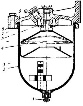 1-сливная пробка; 2-стакан; 3-успокоитель; 4-фильтрующая сетка; 5-отражатель; 6-распределитель; 7-болт; 8-фланец; 9-уплотнительное кольцо; 10-корпус; 11-датчик наличия воды.