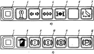 по ним контролируют исправность ламп указателей. Лампа 5 загорается при включении механизма блокировки межосевого дифференциала; она имеет красный светофильтр с символом. Лампы 6 и 7 на всех автомобилях, кроме автомобиля мод. 55102, являются резервными. На автомобиле мод. 55102 лампа 6 — резервная, контрольная лампа 7 загорается при включении механизма подъема платформы прицепа. Лампа 8 сигнализирует о засоренности фильтрующих элементов фильтра очистки масла; она имеет светофильтр красного цвета с символом. Лампы 9, 10 и 11 загораются при снижении давления воздуха, соответственно в контурах I—III пневмопривода тормозных механизмов, имеют светофильтры красного цвета с символами; одновременно с ними включается звуковой сигнализатор Сигнальная лампа 12 горит при включенном механизме стояночной тормозной системы и имеет светофильтр красного цвета с символом.