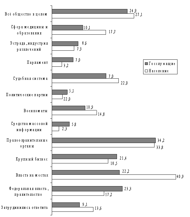 Исследование показало, что, по мнению опрошенного населения, в современной России в наибольшей степени поражены коррупцией такие сферы и институты, как власть на местах (на нее указали 40,9% респондентов), правоохранительные органы (33,8%), все общество в целом (27,1%). Не мало и тех, кто относит к наиболее коррумпированным судебную систему (22,0%), крупный бизнес (18,5%), федеральное правительство (17,2%), медицину и образование (17,7%), военкоматы (14,8%). Редко в качестве наиболее пронизанных коррупцией отмечают индустрию развлечений, эстраду (7,3%), политические партии (3,4%), парламент (3,2%), средства массовой информации (2,3%). То есть к самым коррумпированным население относит те сферы и институты, с которыми им чаще всего приходится иметь дело, – с местной властью, правоохранительными органами и т. п. Или же с теми, кто «по определению» не может не быть коррумпированным, имеются в виду правительство и крупный бизнес, наличие «неформальных» связей между которыми собственно и считается основой и главным проявлением коррупции.