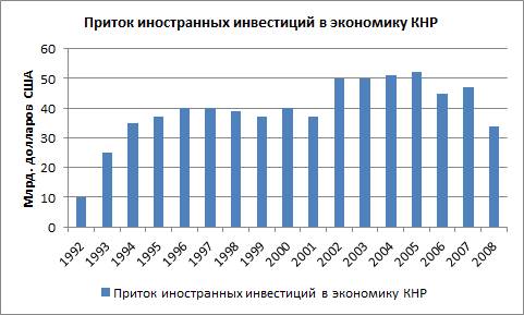 Приток прямых иностранный инвестиций в китайскую экономику увеличился с 10 млрд. долларов в 1992 г. до 53,5 млрд. долларов США в 2003 г. По данным Организации экономического сотрудничества и развития (ОЭСР) в 2003 году по объему привлеченных прямых зарубежных инвестиций КНР вышла на первое место в мире, впервые в истории опередив США.