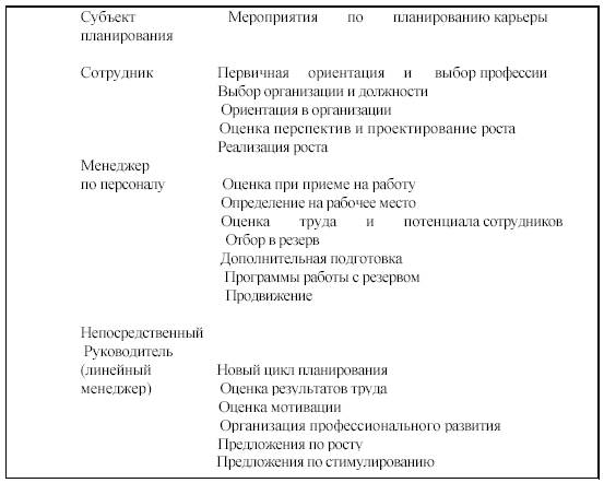Планированием карьеры в организации могут заниматься менеджер по персоналу, сам сотрудник, его непосредственный руководитель (линейный менеджер). Основные мероприятия по планированию карьеры, специфичные для разных субъектов планирования, представлены ниже: